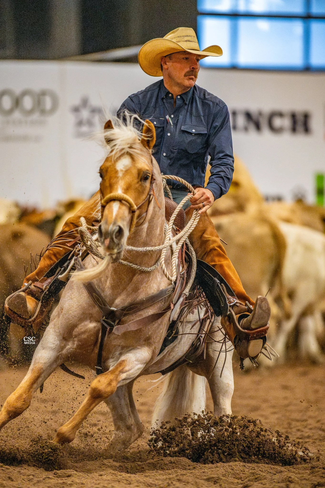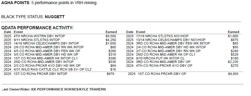 Nuggett is the kind of horse all stallion owners hope they come across. He is drop-dead gorgeous with his unique palomino roan coloring, well balanced conformation, and the way he lights up in front of a cow. He is trained and shown by none other than the 2024 Run for a Million Champion, Kyle Trahern. Together, they have taken Nuggett’s lifetime earnings to over $28,000. This includes a Top 5 Finalist at the 2025 NRCHA Western Derby, and Winning both the Open & Intermediate Open Derby at the 2025 CRCA Firecracker Show.